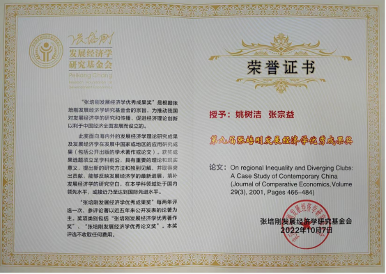 国产一区二区日本在线李安民经济研究院院长姚树洁教授发表在Journal of Comparative Economics(2001,29(3):466-484)的文章On regional Inequality and Diverging Clubs:A Case Study of Contemporary China,于2022年获第九届张培刚发展经济学优秀成果奖。