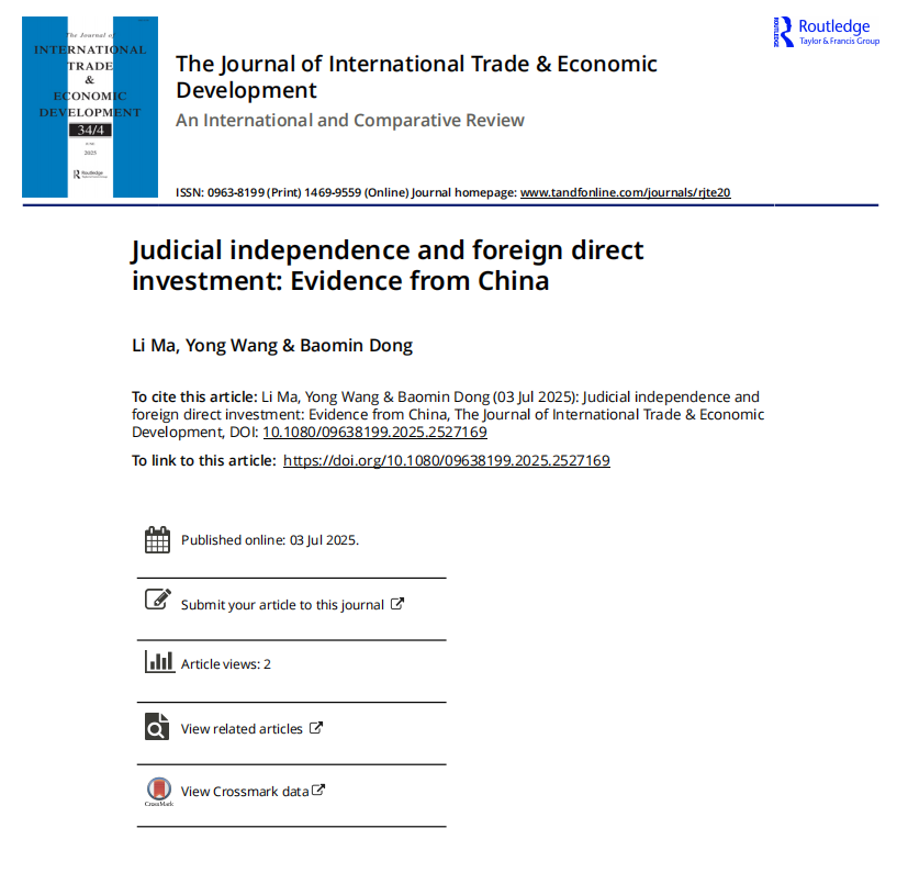 国产一区二区日本在线经济学部副主任董保民教授与中南财经政法大学马莉、华中科技大学汪涌合作的学术论文“Judicial independence and foreign direct investment: Evidence from China”于2025年7月在The Journal of International Trade & Economic Development发表。